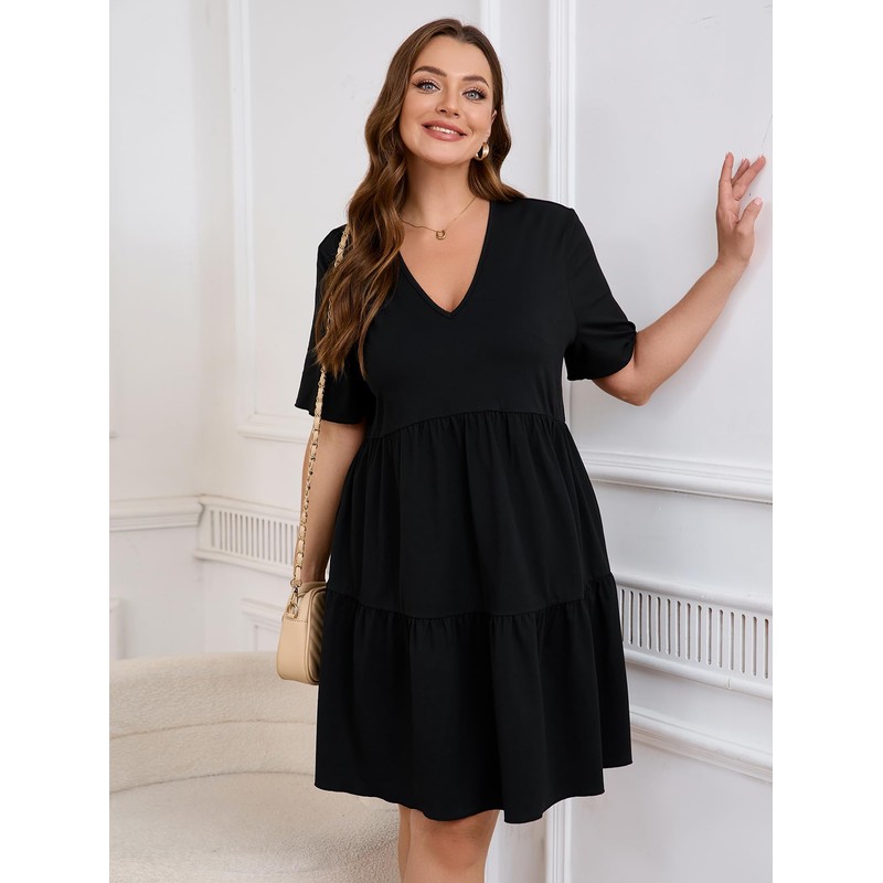 SOLY HUX Women's Plus Size V Neck Short Sleeve A Line Ruffle Hem Babydoll Flowy Dress Black 2XL