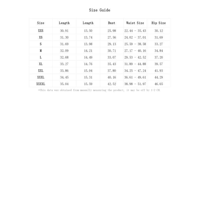 XXXL:Hip Size:44.3IN,Length:34.4IN,Waist Size:36.6-49.6IN,Bust:40.2IN,Length:15.3IN