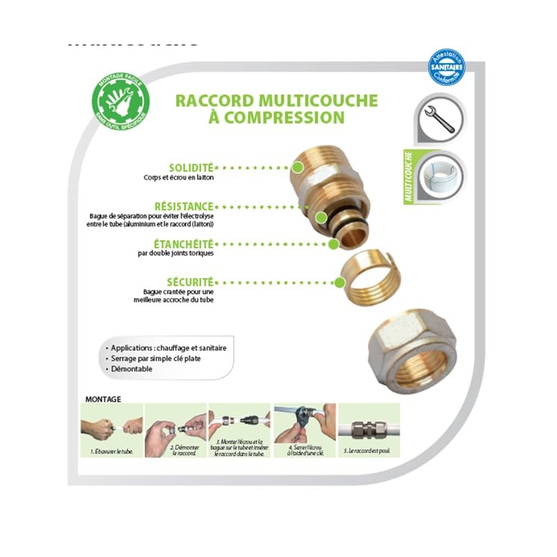 - Connection quick and easy muticouche pipe. No need for special tools, picked up 2 flat enough. Place the nut on the tube to fit the nipple into the tube and screw the nut on the fitting. Connection pipes diameter 16. This connector is removable.