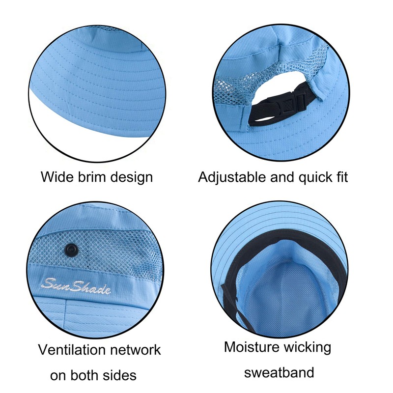 Sombrero de malla de ala ancha para mujer, protección solar UV, con agujero para cola de caballo, Cielo azul puro, Talla única