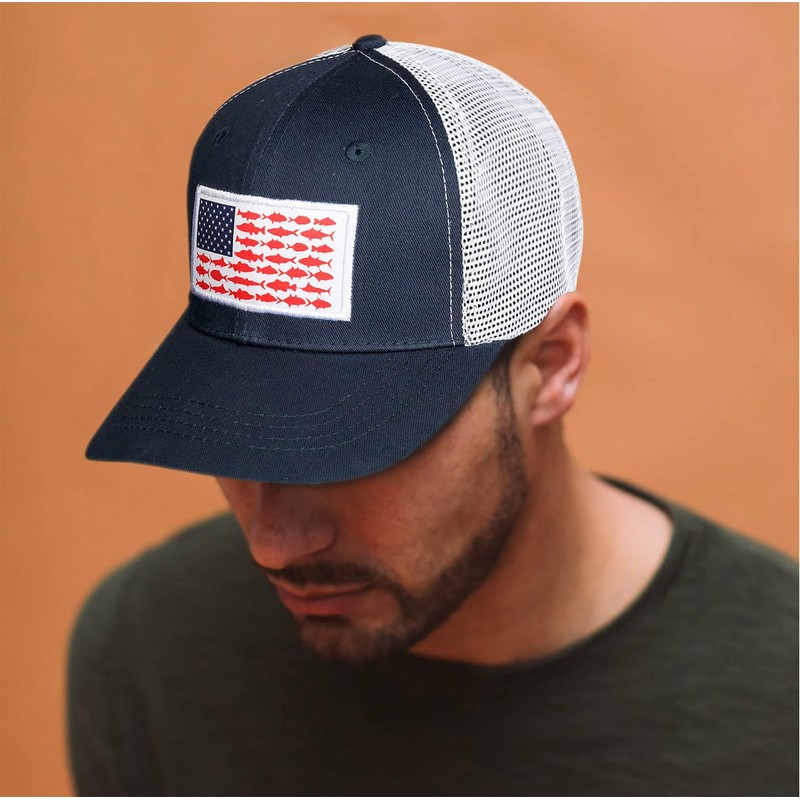 Sombreros de camionero con bandera de pescado americano, regalos de pesca para hombres, sombreros de pesca al aire última intervensión, perfectos para acampar y uso diario, 01. Azul marino, One Size