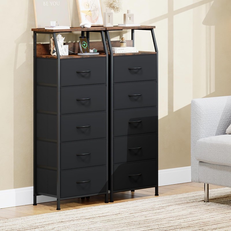 • Multi-functional Storage: This nightstand serves as a charger and bedside table all in one with 2 USB ports, 2 standard sockets, 5 fabric drawers, and a open shelf for books or décor.