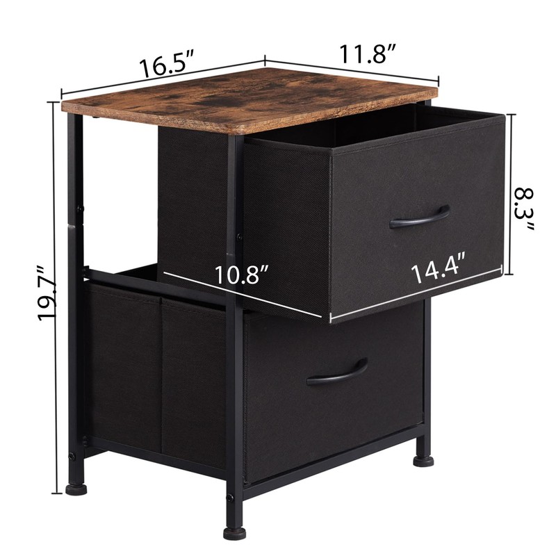Somdot Nightstand with 2 Drawers, Bedside Table Small Dresser with Removable Fabric Bins for Bedroom Nursery Closet Living Room - Sturdy Steel Frame, Wood Top, Pull Handle - Black/Rustic Brown
