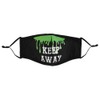 - A three-layer face cover with a green teardrop design and "Keep Away" lettering
