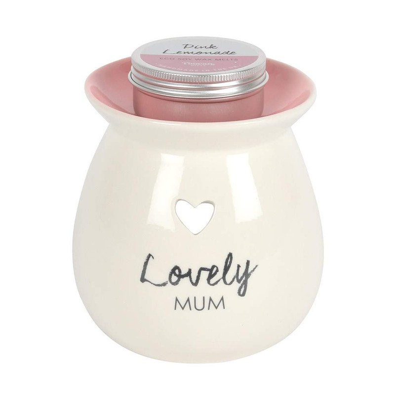 This wax melt burner gift set includes a pink-accented ceramic burner with cutout heart and ‘Lovely Mum’ text. Includes a tin of Pink lemonade eco soy wax melts in a lovely gift box and makes a lovely gift for Mother’s Day.
