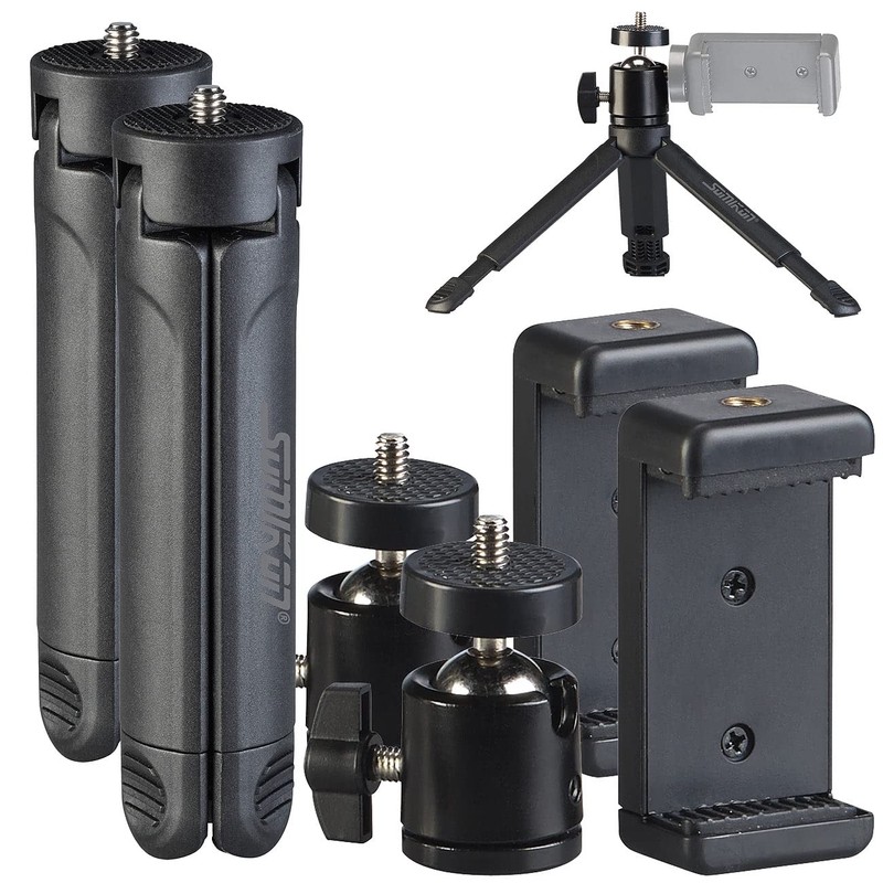 • Tripod height adjustable to two levels: 12.3 or 15.5 cm. Rotating smartphone holder for smartphones with 55 to 85 mm width. Dimensions: 25 x 5 x 3 cm each. Weight: 167 g each