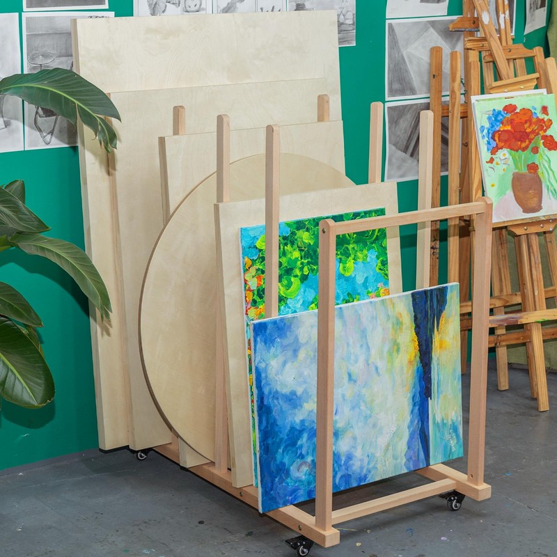 - Free Movement: Somime wooden print rack is easy to install with simple installation instructions. A sturdy handle and 4 casters wheels allow it to move effortlessly with full storage. Lockable wheels can secure the canvas storage rack to any area you need