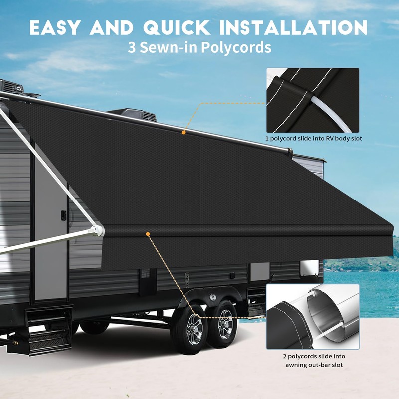 - EASY INSTALLATION -For easier and time-saving installation, our RV awning fabric is designed with 3 polycords, which are fixed with reinforced stitching. You just need to slide the polycords into the roller slot of your existing RV awning skeleton. We also provide installing instructions and linked video tutorial, please read it carefully before starting for your qucik and correct installtion