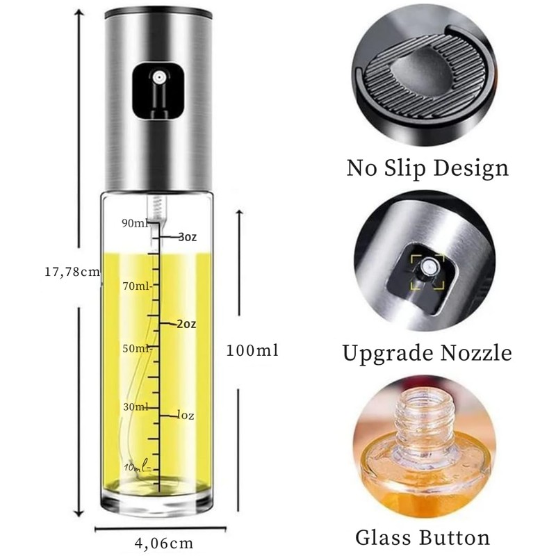 - 🫒 Feiner & gleichmäßiger Sprühnebel: Spart Öl und verteilt es optimal auf Pfannen, Salaten oder Grillgut – für gesünderes Kochen mit weniger Fett.