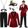- Diverse combination for your Halloween costume: you will receive 1 piece of red silk robe jacket, 1 pack of black pants, 1 piece of captain hat, 1 pair of sunglasses, 1 piece of fake pipe, 1 piece of captain necklace, and 1 piece of captain bracelet, offering you a rich and complete outfit for Halloween
