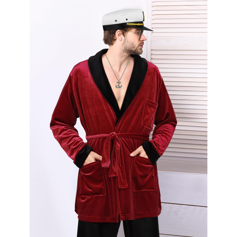 SOMSOC Halloween Red Silk Robe Jacket with Captain Hat Accessories and Black Pants Men's Captain Costume Set with Toy Pipe