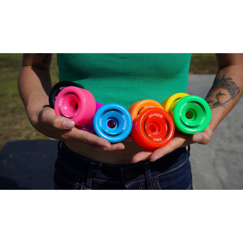 Whether you are a casual skater or an outdoor enthusiast, these skate wheels are a great fit for you. The Sonar Zen features a 85A hardness urethane formula created to give skaters good roll at an affordable price. These 32mm x 62mm wheels are available in 8 great colors; black, blue, pink, red, green, orange, yellow, and magenta. The Sonar Zen is the perfect recreation skating and outdoor trail skating wheel to fit your lifestyle. The Sonar Zen is the perfect skate wheel for anyone who wants a quality wheel at a reasonable price. Sold in packs of four wheels. To order a full set of wheels, be sure to set your quantity to two.