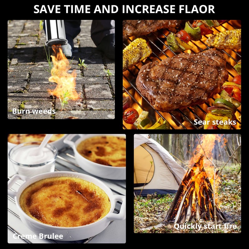 • Versatile and Precise Culinary Tool: This hand torch is not only a great kitchen helper for searing steaks, caramelizing crème brûlées, glazing hams, roasting peppers, and melting cheese with precision, but also handy for lighting fireplaces, candles, and useful in various outdoor and crafting activities. With an adjustable fuel control that can reach up to 1800℃/3272℉, it offers unmatched precision in cooking.