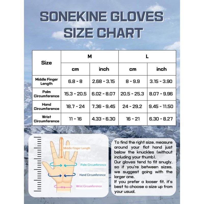 - Size information * Medium: width 11-13cm(4.33~5.11inch) and length 20-22cm(7.87~8.66inch), * Large: width 13-15cm(5.11~5.9inch) and length 21-23cm(8.26~9.1inch). The sizes might vary a bit because of the stretchy material. These gloves are super flexible and fit both men and women.