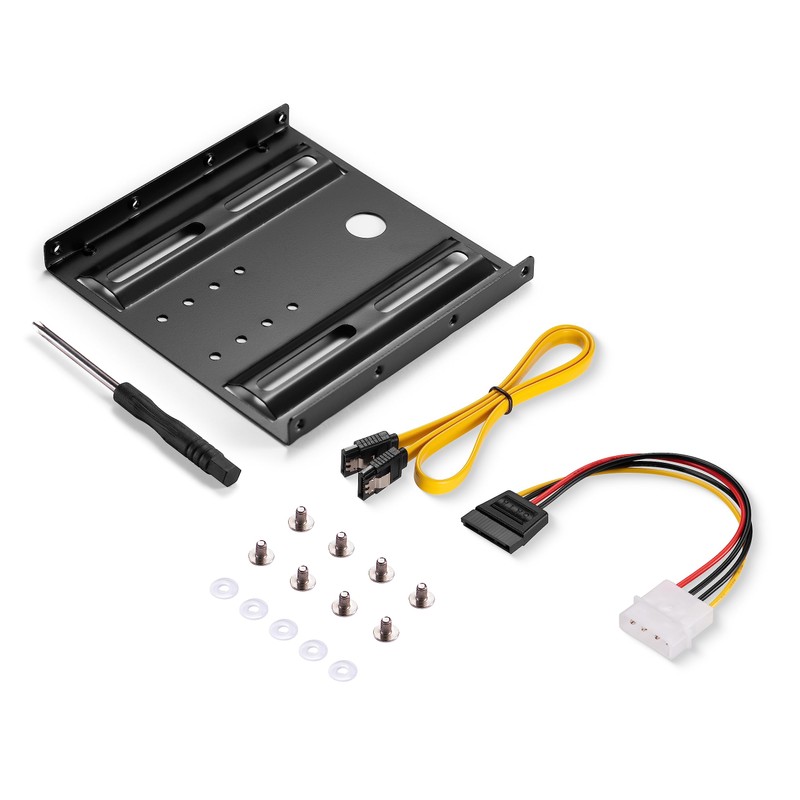 - In addition to the SATA SSD mounting frame, there is also a 0.50m SATA III 6Gb/s cable in yellow, a power adapter 4pin to SATA and the corresponding screw set.