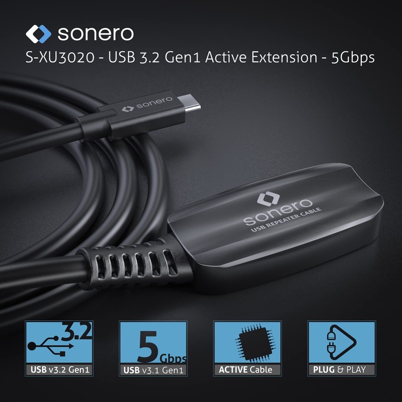 - Sonero Active USB 3.2 Extension Cable has a USB-C plug and USB-A plug. Therefore, an existing USB cable can be extended to longer distances without any problems.