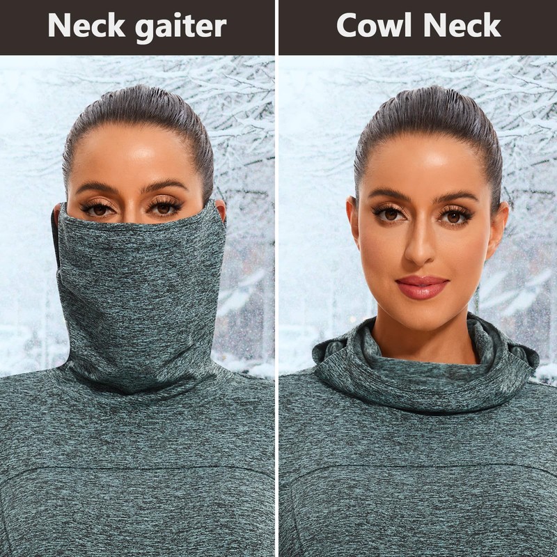 - TURTLENECK & THUMB HOLES: The cowl neck design helps block harmful UV rays in bright sunlight and protects against the wind and cold. The thumb holes keep the sleeves in place, preventing them from shifting or flapping in the breeze, and they help trap warmth.