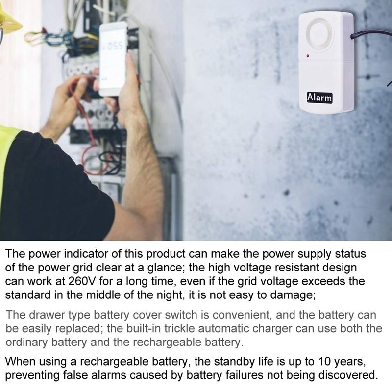 - Sensitive design: when the power is disconnected or the power cord is unplugged, an alarm will be immediately emitted until the power supply is restored or the battery is exhausted.