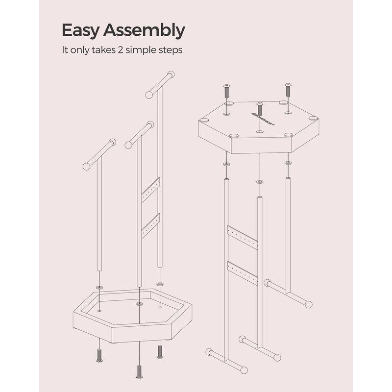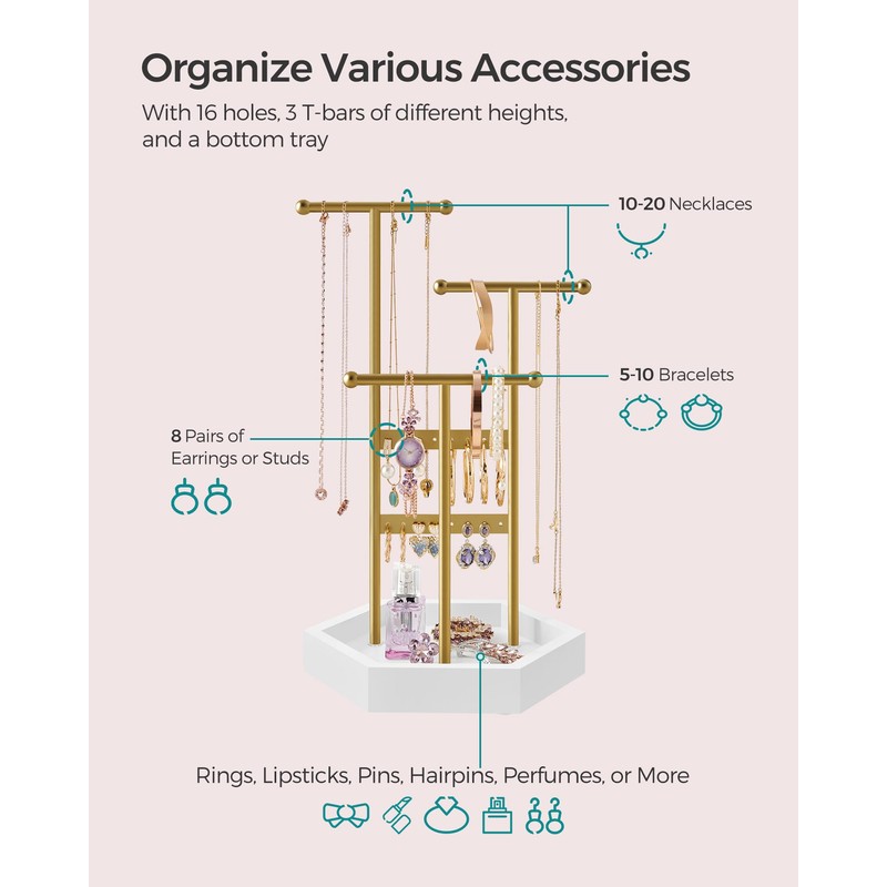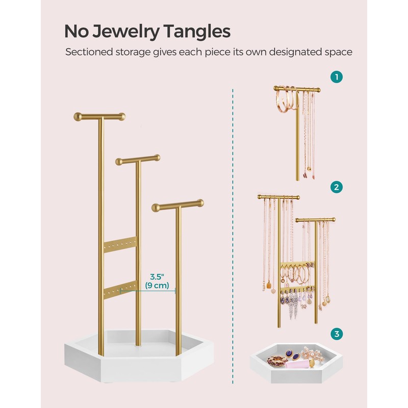 - [Sturdy, Durable, and Stable] The jewelry stand is a stable and safe haven for your treasured jewelry, thanks to a hexagonal base and 3 metal T-bars arranged in a triangular distribution and securely screwed to the base