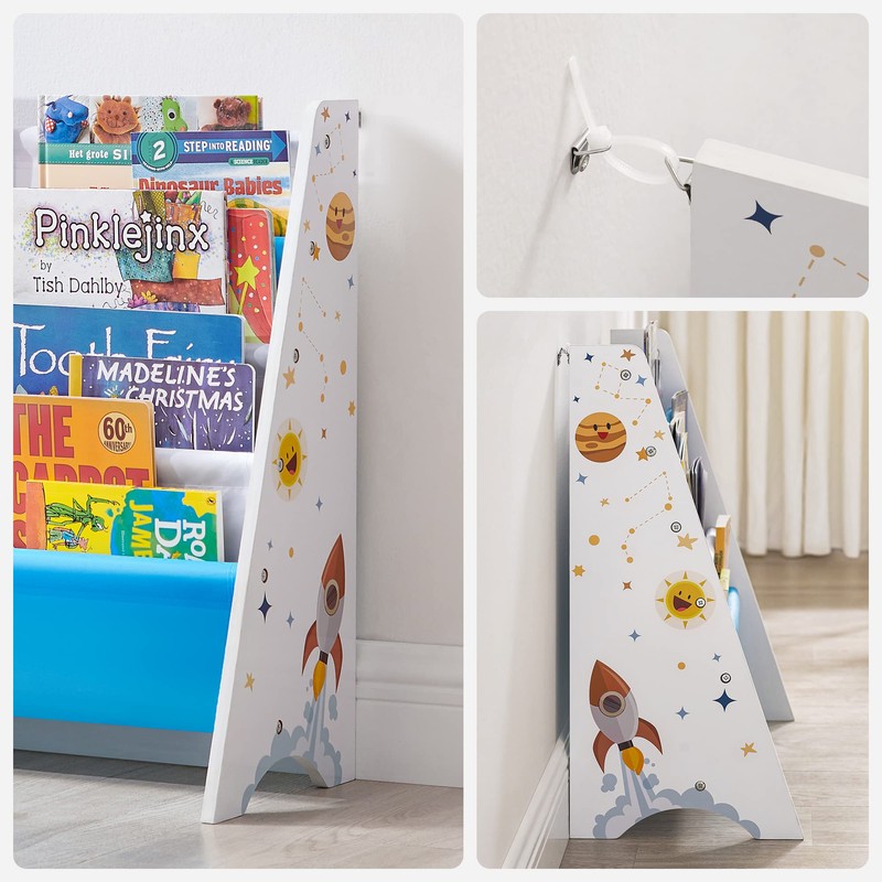 **Practical and Space-Saving** With this bookcase, you don’t need to organize your kids’ books, as it will attract them to do it by themselves. With a large storage capacity on 4 levels, it saves space in children's rooms, playrooms and living rooms as well as in daycare centers and nursery schools. **Towards New Explorations** This bookcase accompanies your kids as they grow up while attracting them to read. The height makes books always within kids’ reach. Shelves of different colors help them identify, sort and better organize their favorite books. The outer space themed patterns foster their exploration spirit, strengthen their interest in the world and stimulate their creativity. **Specifications:** \- Color: White, Blue, Gray \- Material: Particleboard, Polyester \- Product Size: 24.6”L x 11”W x 23.6”H (62.5 x 28 x 60 cm) \- Product Weight: 5.5 lb (2.5 kg) **Package Contents:** \- 1 x Bookcase \- 1 x Accessory Kit \- 1 x Instructions **SONGMICS Notes:** \- Do not wash the product with water, except the fabric. Clean it with a damp cloth and air dry.