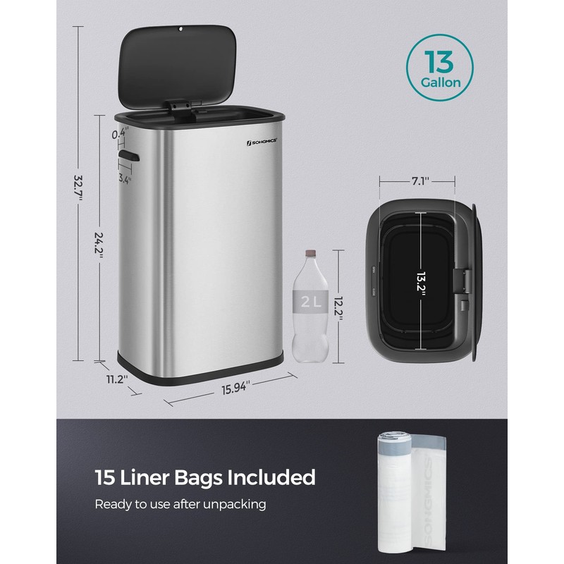 SONGMICS Motion Sensor Trash Can, 13 Gallon Automatic Garbage Can with Soft-Close Lid and Bag Retainer Ring, Stainless Steel, Touchless Kitchen Trash Bin, 15 Trash Bags Included, Silver ULTB610E50