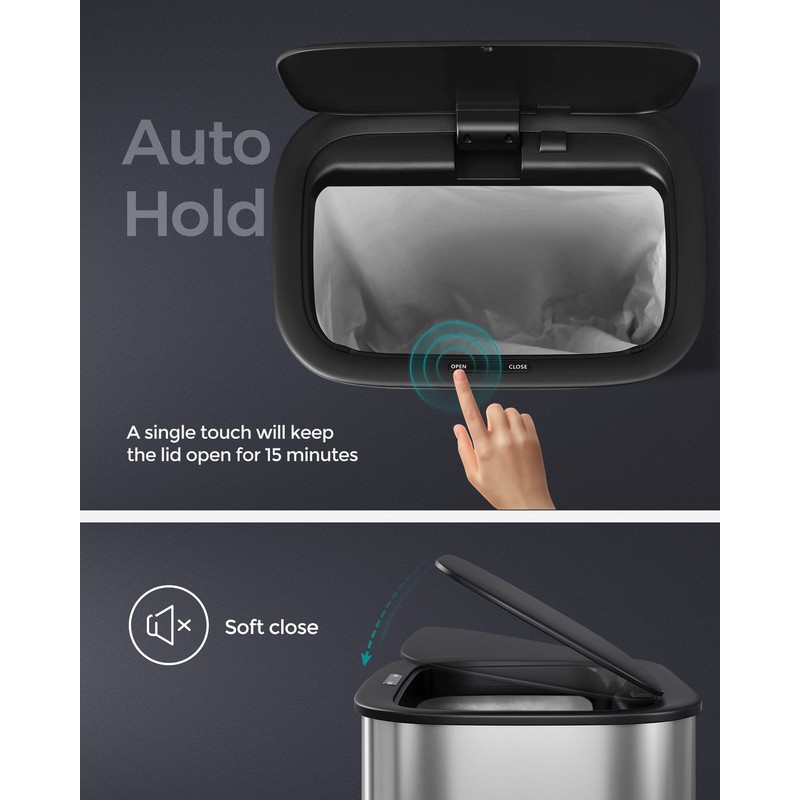 - [Closes Softly & Stays Open] This kitchen trash can has a smooth, slow, and silent close lid. The lid can stay open for 15 minutes by touching the “OPEN” button when you do large clean-ups