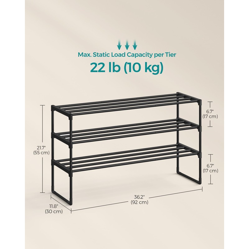 - [Robust and Durable] Connected by quality plastic connectors, this shoe organizer made of thick metal tubes holds up to 22 lb per tier, giving your footwear a reliable home