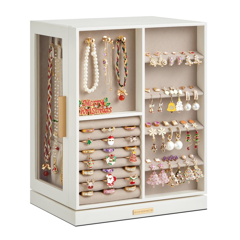 SONGMICS Jewelry Box 360° Rotating, Jewelry Storage Case with 5 Drawers, Jewelry Organizer, Glass Window, Spacious, Vertical Jewelry Storage, Open Design, Christmas Gift, Cloud White UJBC170W01