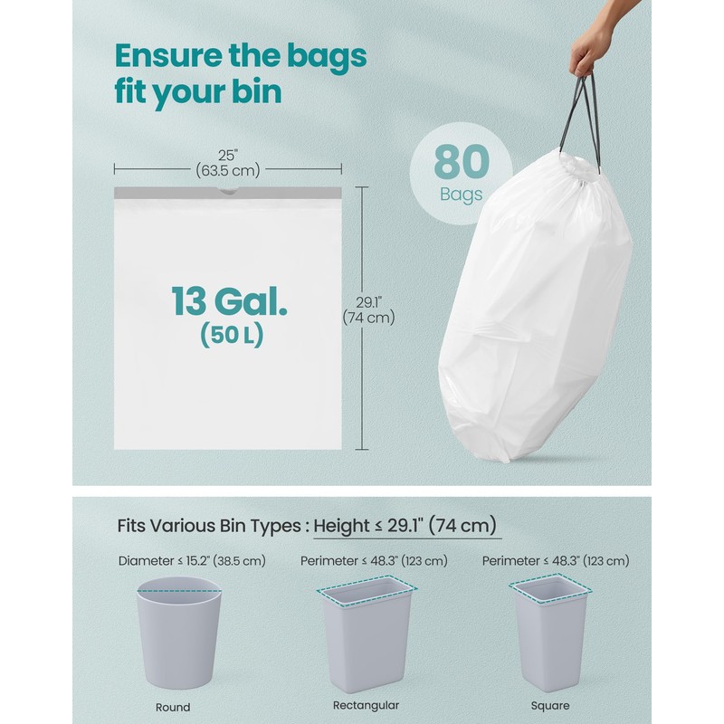 - [Convenient Drawstring] The handy drawstrings on both sides of the bag allows for easy closure and removal of the garbage. The drawstrings grip the bin rim tightly without sliding down and effectively seal the bag, trapping any unpleasant smells