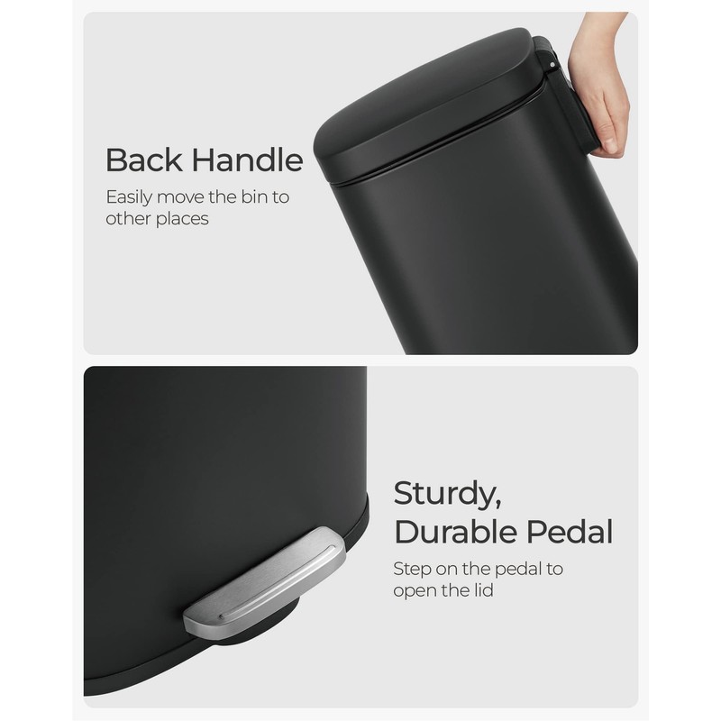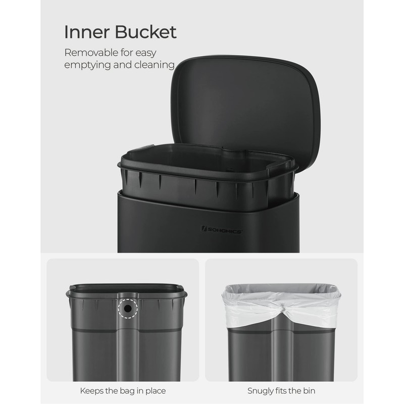 - [Hidden Conveniences] The trash bag can be secured in place by tucking the bag edges into the back hole of the removable inner bucket. When needed the back handle can be used to move the bin around