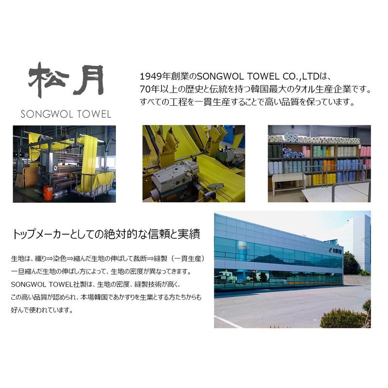 - SONGWOL TOWEL CO.,LTD Since 1949, the largest towel manufacturer in Korea, with over 70 years of history and tradition. All processes are produced consistently to ensure high quality