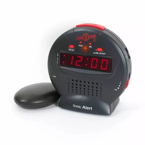 The new Sonic Bomb Jr., AKA "The Bomb Jr™", from Sonic Alert, has been designed for guys and girls of all ages on a mission and a budget. Stealth black with red controls, night vision display and pulsating alert light, Jr. won't keep you in the dark. Complete with bed shaker and 102 decibel's of extra loud sound. No more late classes or late mornings at work.