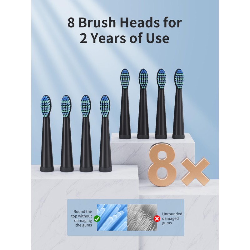 - Smart Vibrating Notification Timer- A built-in smartchip coaches you to a healthier smile by offering aninterval pause every 30s, so you know to move on to anew quadrant of your mouth. An auto-timer powers thisAirone electric toothbrush down automatically, lettingyou know you've brushed for the full dentistrecommended 2 minutes IPX7 WATERPROOF & What's Included-IPX7waterproof tooth for brush, no worry short battery life.you can use it at bath and shower. Include:1*ElectricToothbrush ,8* Dupont Toothbrush Heads, 1* USBCable,1*Instruction Manual