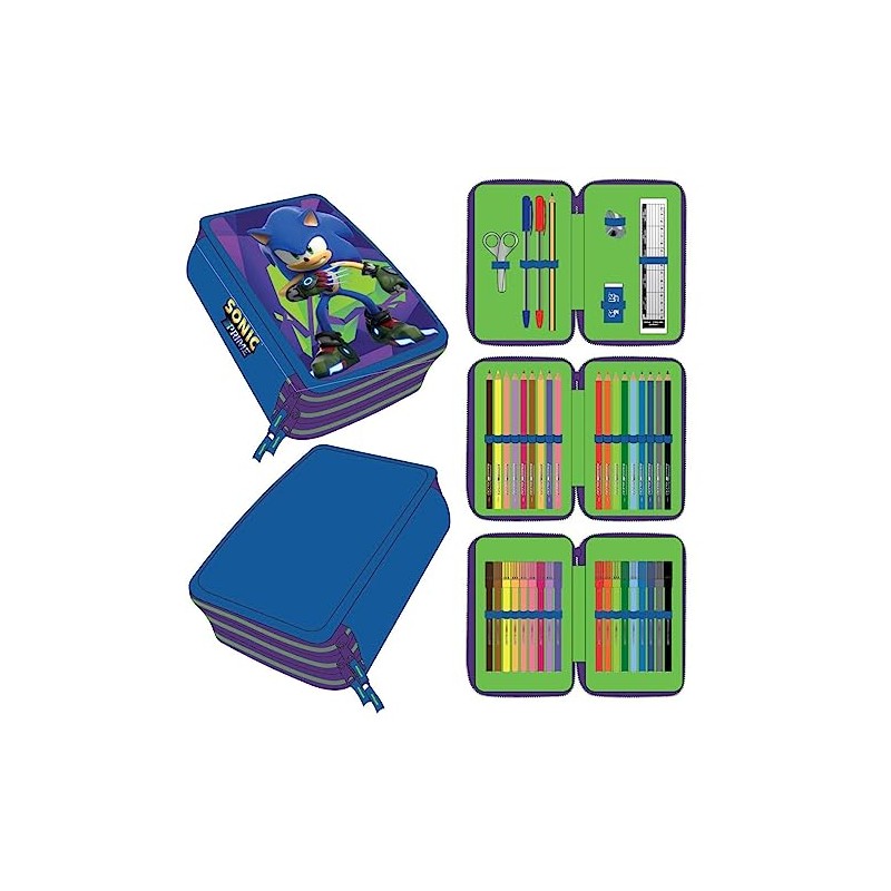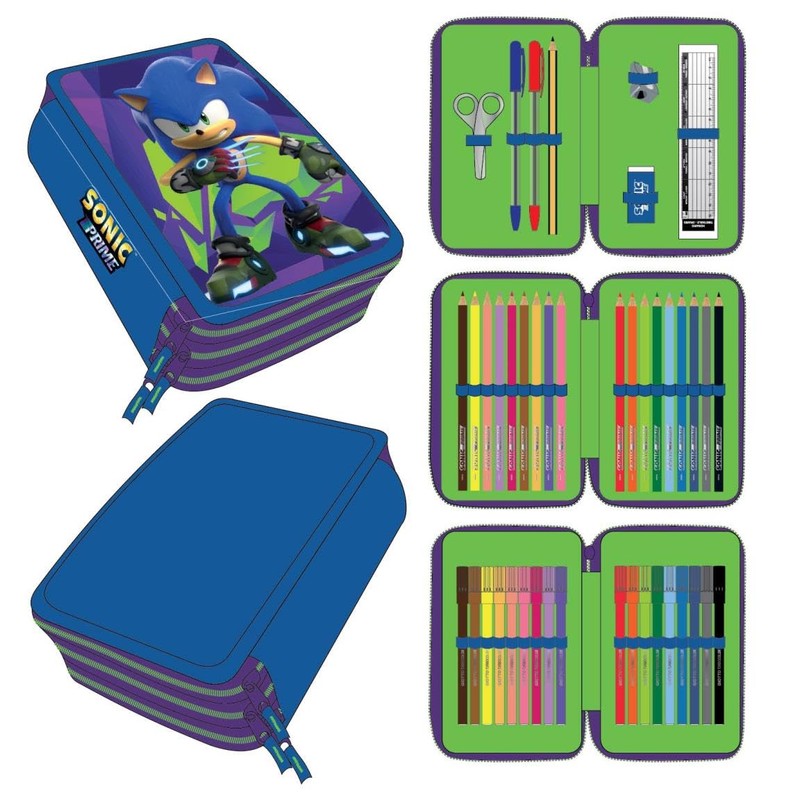 Sonic Prime Pencil Case with Accessories - Purple and Blue - 12.5 x 6.5 x 18.5 - Made of Polyester - Pencil Case with Three Compartments and Zip - Original Product Designed in Spain