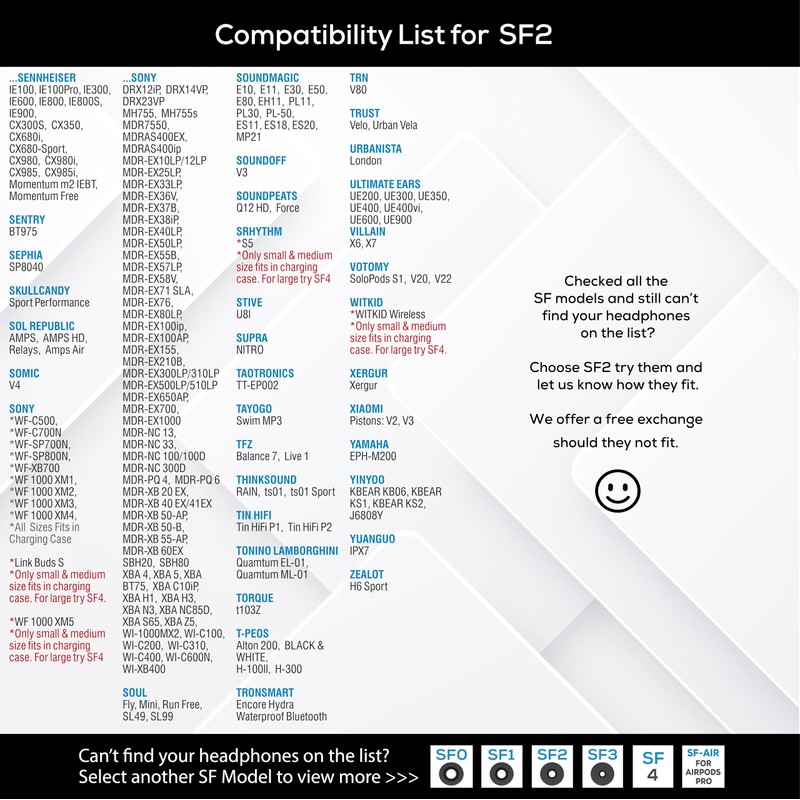 Select an SF model, then view the compatibility list on each SF model to see if your headphone and charging case are compatible with Sonicfoam tips.