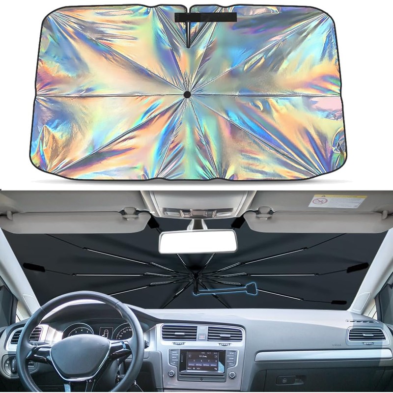 Sonnenschirm Auto Frontscheibe Sonnenschutz mit Regenbogen-Effekt, Verbesserter 360° Drehbarer Griff Faltbar UV-Schutz Universell Sonnenblende für Limousinen, SUV