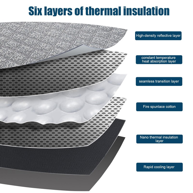 - 6 Schutzschichten: Es besteht aus 6 Schichten wärmeisolierender Materialien.Die 6 Designschichten umfassen eine reflektierende Schicht mit hoher Dichte, eine Wärmeabsorptionsschicht mit konstanter Temperatur, eine nahtlose Übergangsschicht, feuerfeste Spunlace-Baumwolle, eine Nano-Wärmeisolierschicht und eine schnelle Abkühlung Schicht. Bietet besseren Sonnenschutz und blockiert bis zu 99 % der schädlichen UV-Strahlen und Hitzestaus.