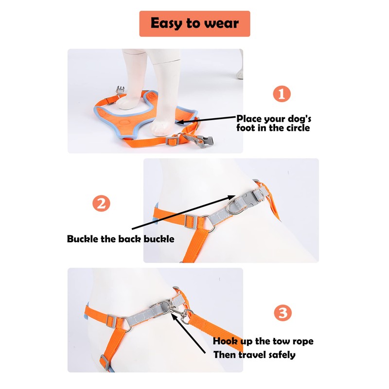 Easy to Use Just insert your forefoot into the hole and then attach the side to the back for quick snaps for easy on and off. The adjustable length of the straps on both sides ensures a better fit on your pet/dog harness. Equipped with a 1.5 metre long rope, it is ideal for daily walks, jogging, hiking, sports, outdoor recreation and much more. Reflective strips are attached around the harness, making it easy to determine the dog's movement path in darker environments, making it easy for people to find it and provide your pet with a safer and more comfortable outdoor experience.