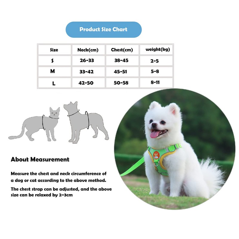 - Multiple choices: There are a variety of colour size models to choose from: please measure the size before ordering and give priority to the bust, followed by the neck. Please choose the appropriate size model according to the size comparison chart in the picture. This vest harness is ideal for pets such as cats, dogs and other small and medium breed pets.