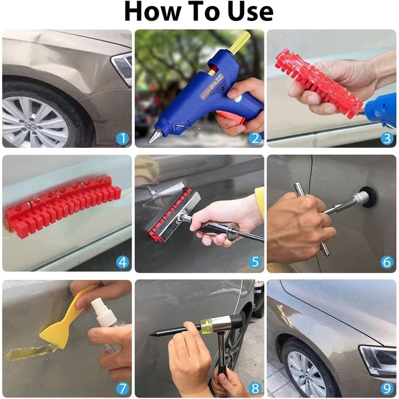 Sometimes we find a small dent in the car. How to repair that? Go to 4S shop? the dent wasn't touched off the paint, if go to the repair shop to pull the gold you will distressed original paint, but also worried about the color. In fact, this dent puller kit is professional to repair, saving you time and cash as you witness these tabs restore your car's allure like it's never been damaged before.