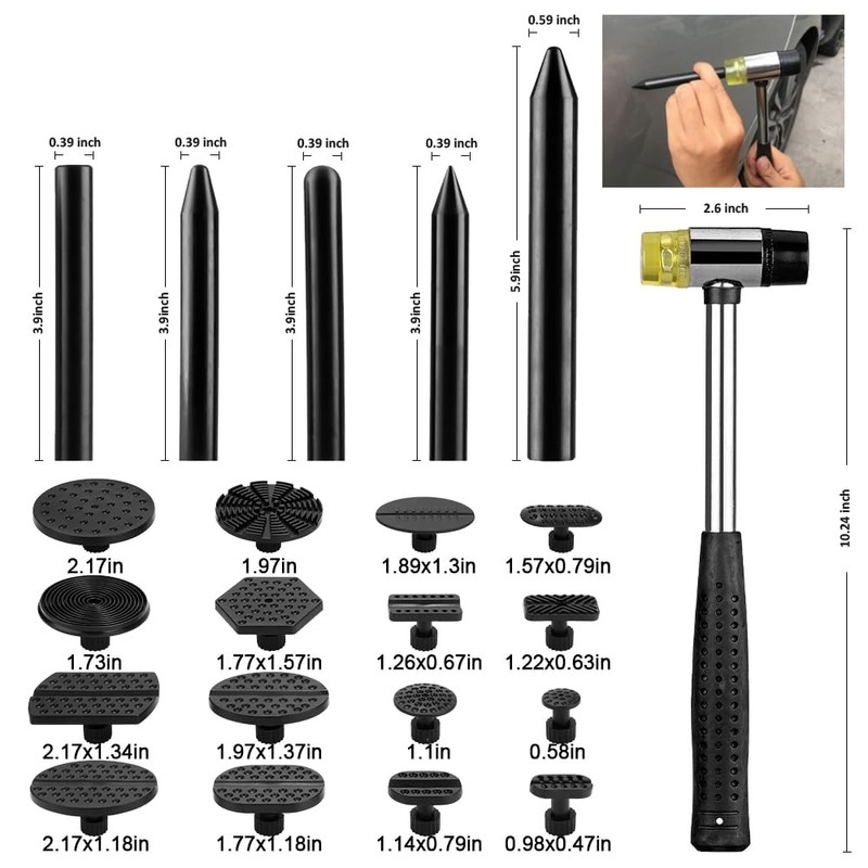 - 🚗Package Including: 1pc T-bar Dent Puller, 16pcs Black dent puller tab, 2pcs Red larger adjustable connector tabs, 1pc Hot glue gun, 10pcs Strong stickiness hot melted glue sticks, 1pc Rubber hammer, 5pcs Plastic tab down pen, 2pcs Glue shovels, 1pc Empty bottle, 1pc Black clean cloth, 1pc User's manual