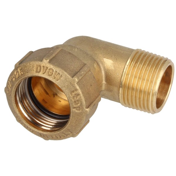 - Brass clamp connector for PE pressure pipe 90° angle with one-sided external thread. Design: 1/2 inch male thread x diameter 20 mm
