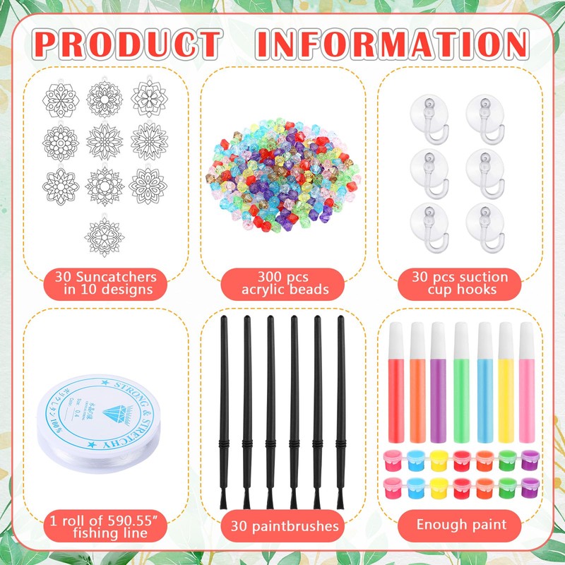 - Mandala DIY Craft Kit: 30 Sets DIY window art suncatcher kits Include 30pcs Mandala DIY suncatcher making kits in 10 designs, with semi-transparent pigment and glow in the dark color suncatcher paints, 30 paintbrushes, 300pcs acrylic beads, 1 Roll of 590.55” fishing line, 30pcs suction cup hooks; This comprehensive kit provides hours of artistic enjoyment, making it a good choice for family activities, projects, or alone art time