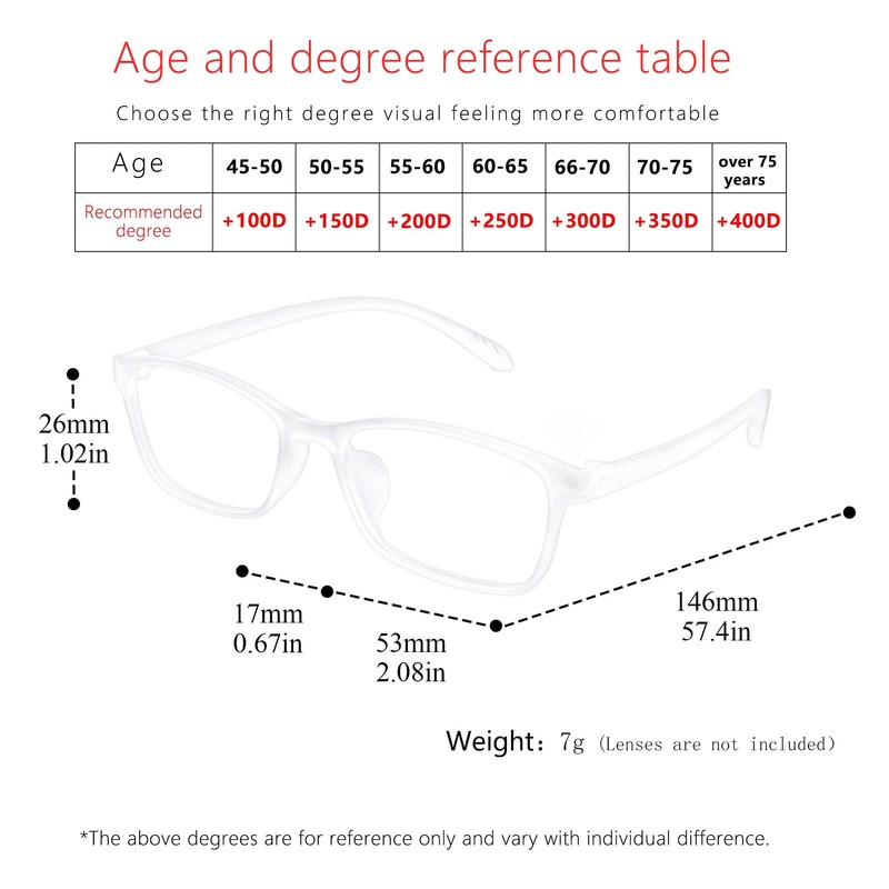 • TR90 Glasses Frame -- Super light weight,7g,reduces pressure for nasal bridge.Flexible and elastic frame fits most face shapes without leaving red marks.Comfortable clamping force reduces head pressure.Upgraded glasses frame, remove the hinge, no screws, no looseness,snap link.