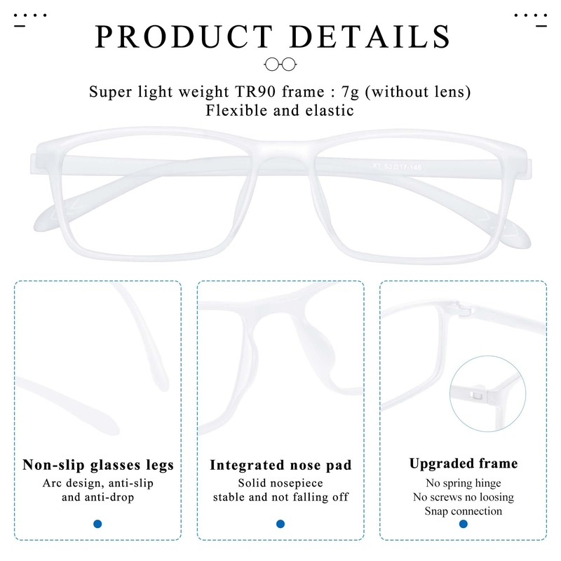 - TR90 Glasses Frame -- Super light weight,7g,reduces pressure for nasal bridge.Flexible and elastic frame fits most face shapes without leaving red marks.Comfortable clamping force reduces head pressure.Upgraded glasses frame, remove the hinge, no screws, no looseness,snap link.