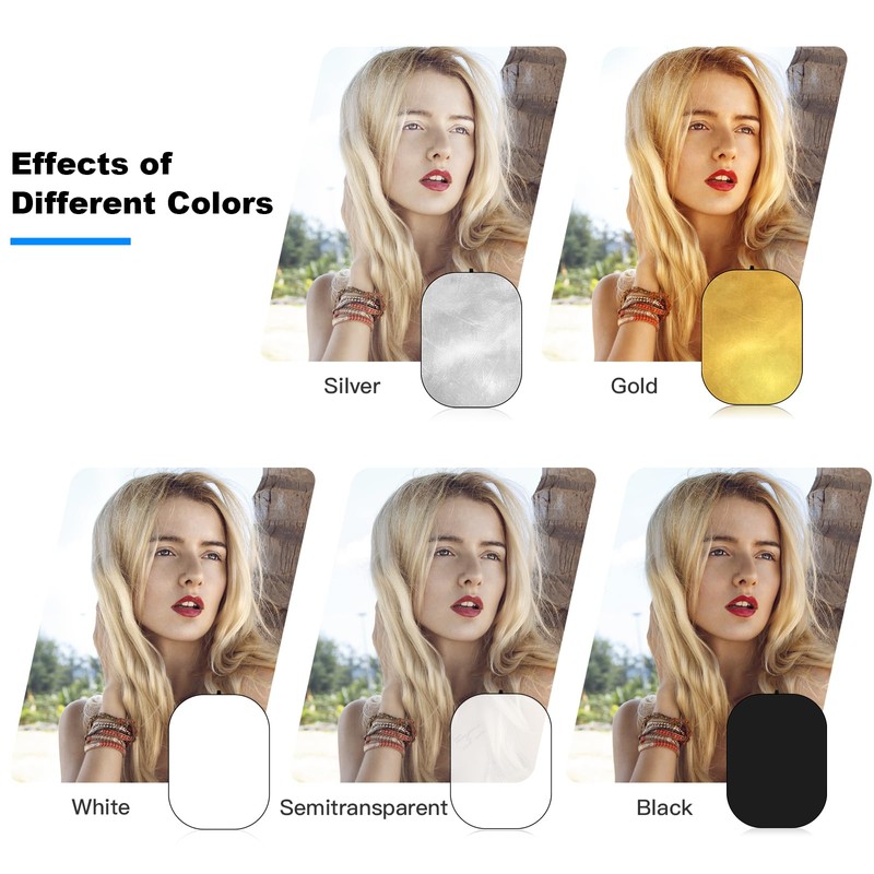 - 【Note】This 5-in-1 light reflector includes one translucent panel with four color covers that provide five photography effects, not five respective reflectors.