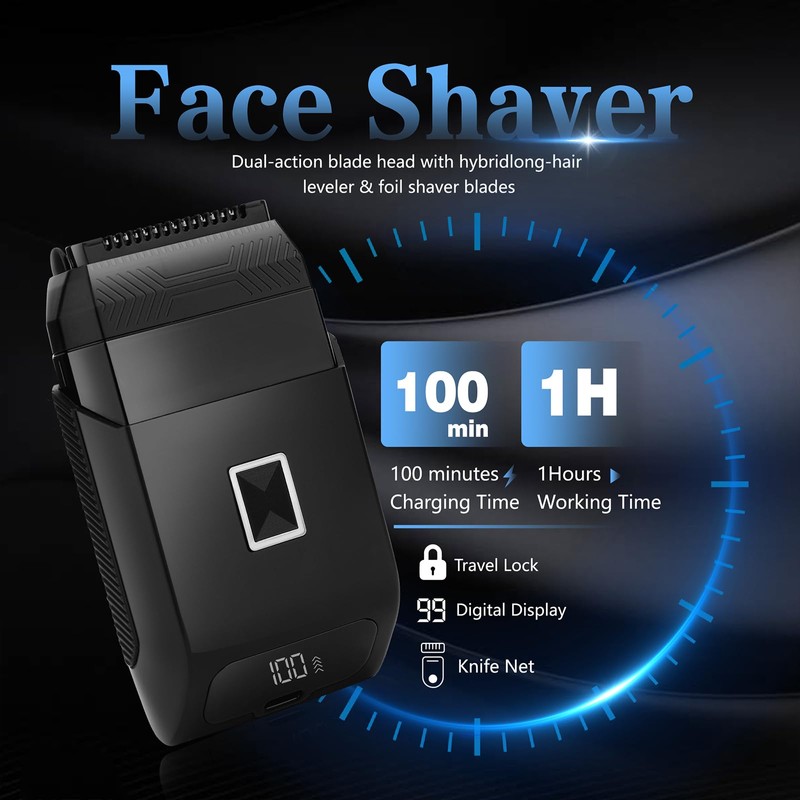 - The Face Shaver: Our precision compact face shaver is designed with a dual-action blade head, featuring both a long-hair leveler and a foil shaver blade. It is lightweight and user-friendly, equipped with a mess-free magnetic protective cover. Charge your trimmer for 100 minutes to enjoy one hour of cordless operation