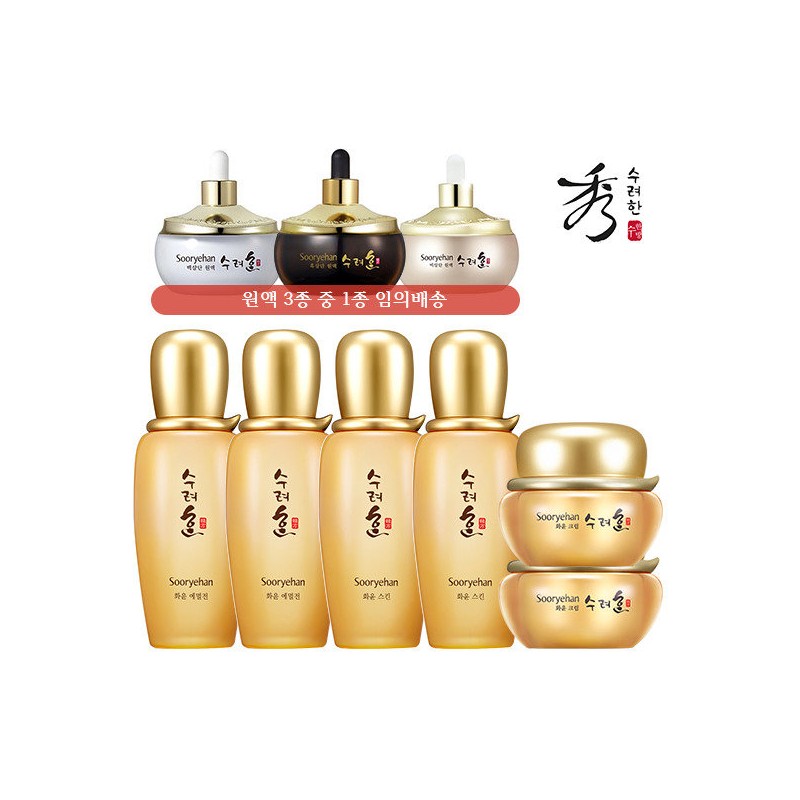 - Volume or weight of contents: Sooryehan Hwayun Skin 80ml x2, Sooryehan Hwayun Emulsion 80ml x2, Sooryehan Hwayun Cream 25ml x2, 1 type of Sooryehan concentrate (random between Bisamdan, Heuksamdan, and Baeksamdan) 45ml