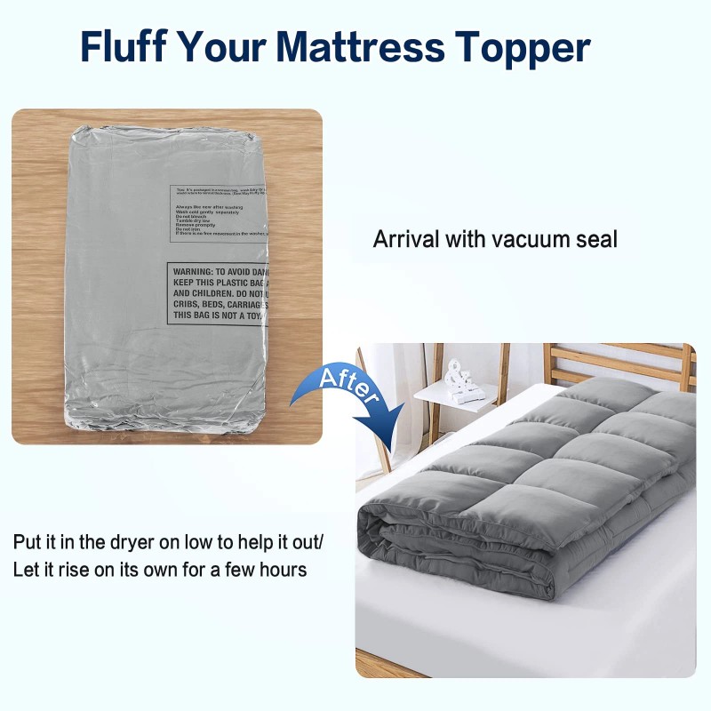 Customer Service: Since the mattress topper comes in a vacuum bag, we advice to tumble dry it on low heat to let air fluff it up. Please feel free to contact us about how to fluff it and any other issues. We will definitely give you a satisfactory reply in time