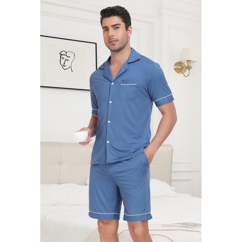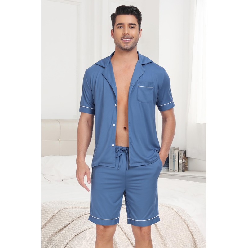 - đăSimple and comfortableăClassic design, simple lines make the whole set of men's shorts pyjamas look simple, fashionable and beautiful, the top button closure is easy to put on and take off, and the pyjamas bottom with elastic drawstring and pockets are convenient for you to store your mobile phone, keys and other small items